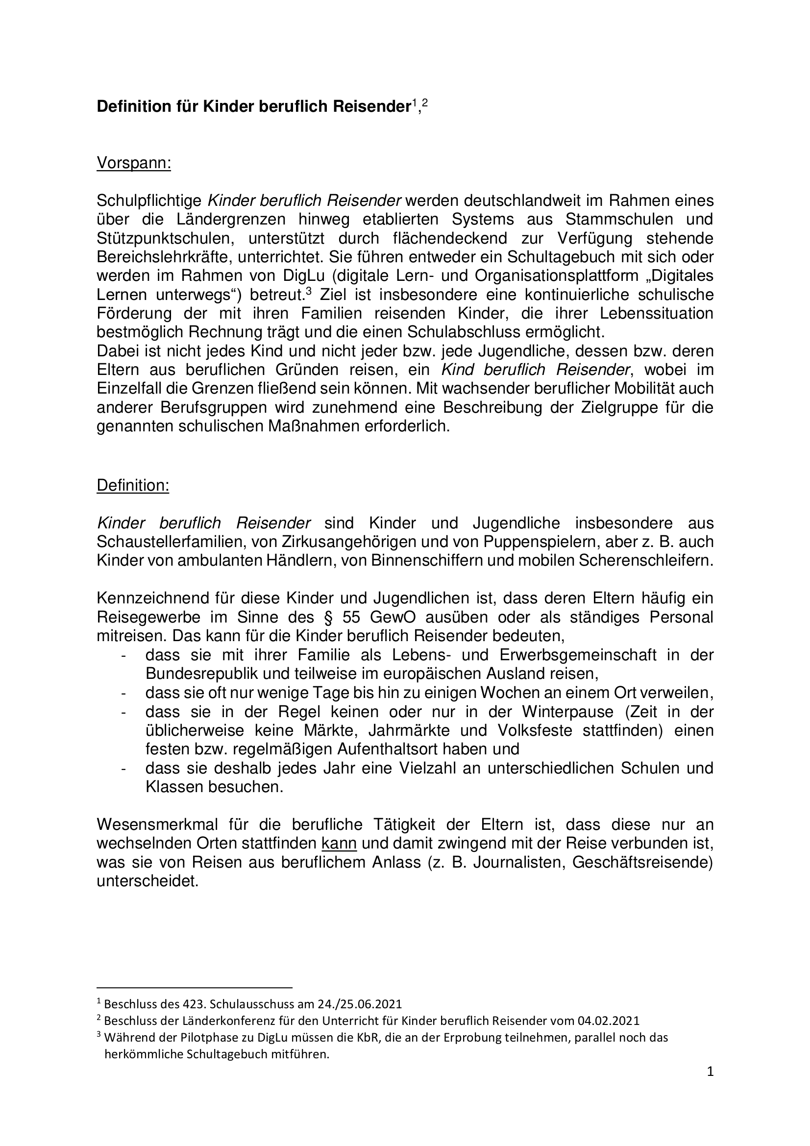 Der Beschluss der Länderkonferenz für den Unterricht für Kinder beruflich Reisender vom 04.02.2021 und der Beschluss des 423. Schulausschuss am 24./25.06.2021 hat oben stehende Definition für Kinder beruflich Reisender benannt